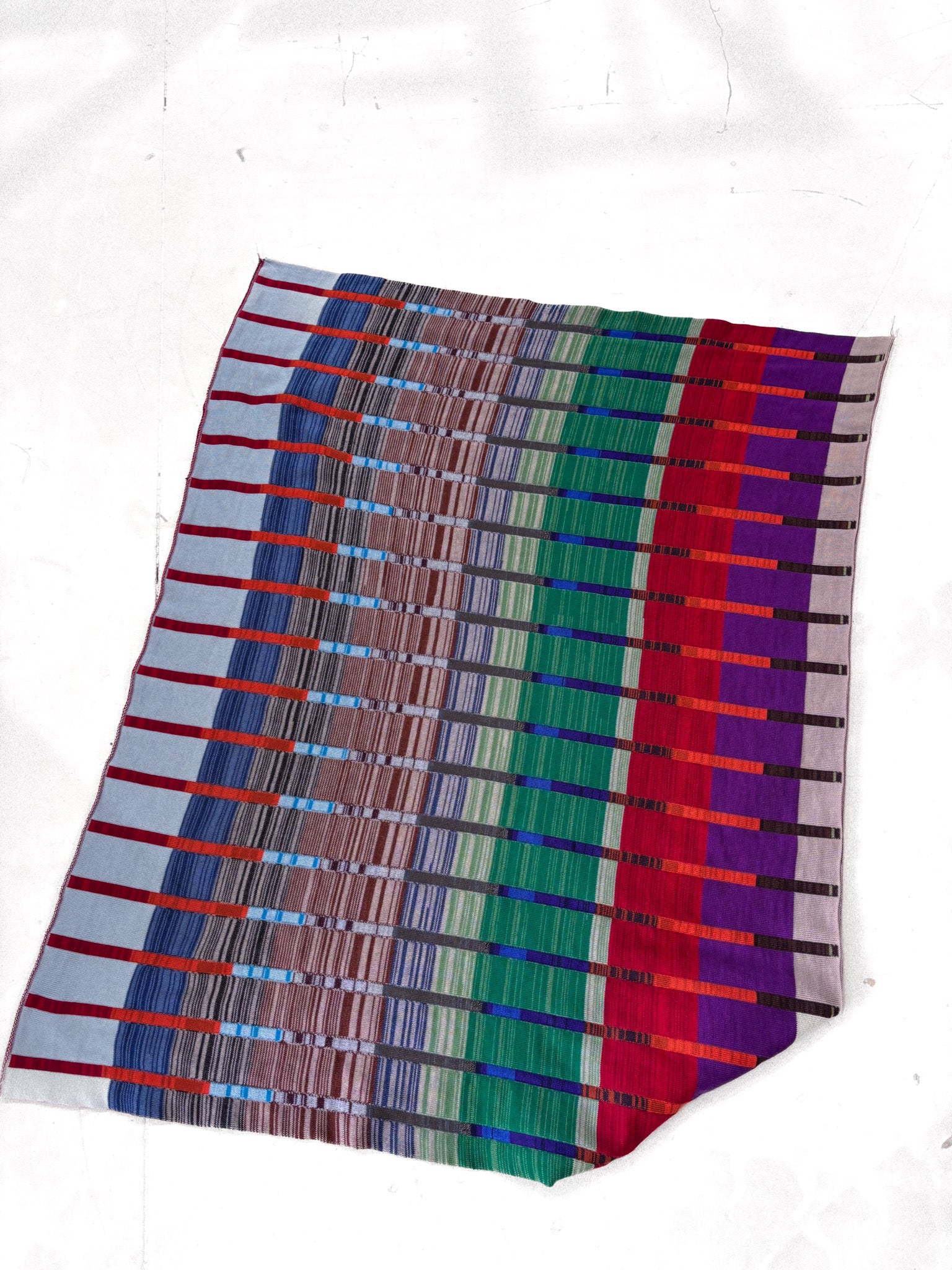 This blanket is made entirely by intuition. I choose what draws me in, tie each new thread by hand, and keep going until the length is reached. Over 120 colour changes, each one impossible to repeat. I couldn’t make the same thing again, even if I tried.