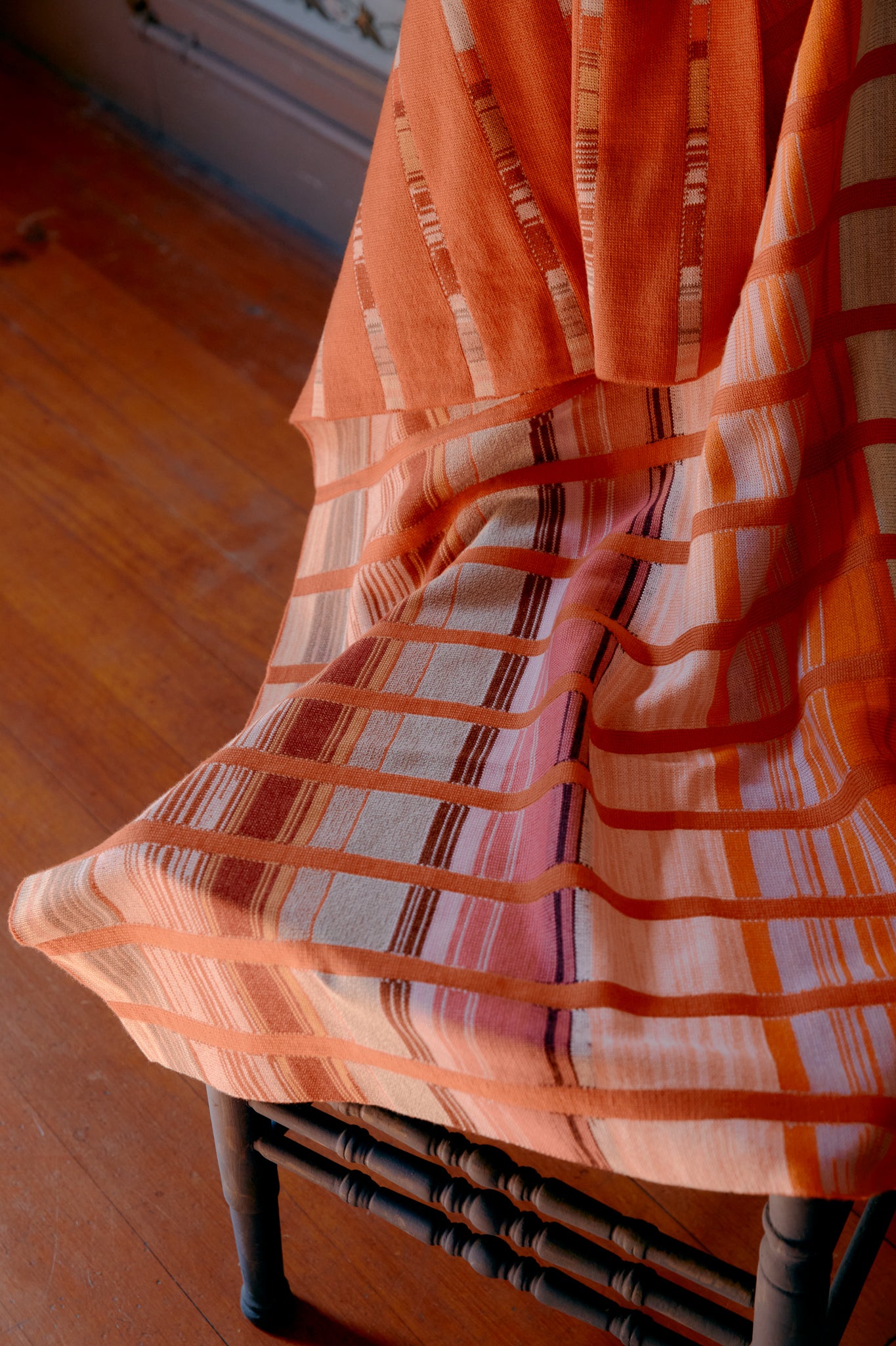 The front and back of this blanket are different, a result of the many yarns used. On this piece, one side has a thick, bold stripe of orange, while the reverse reveals a finer, more delicate version