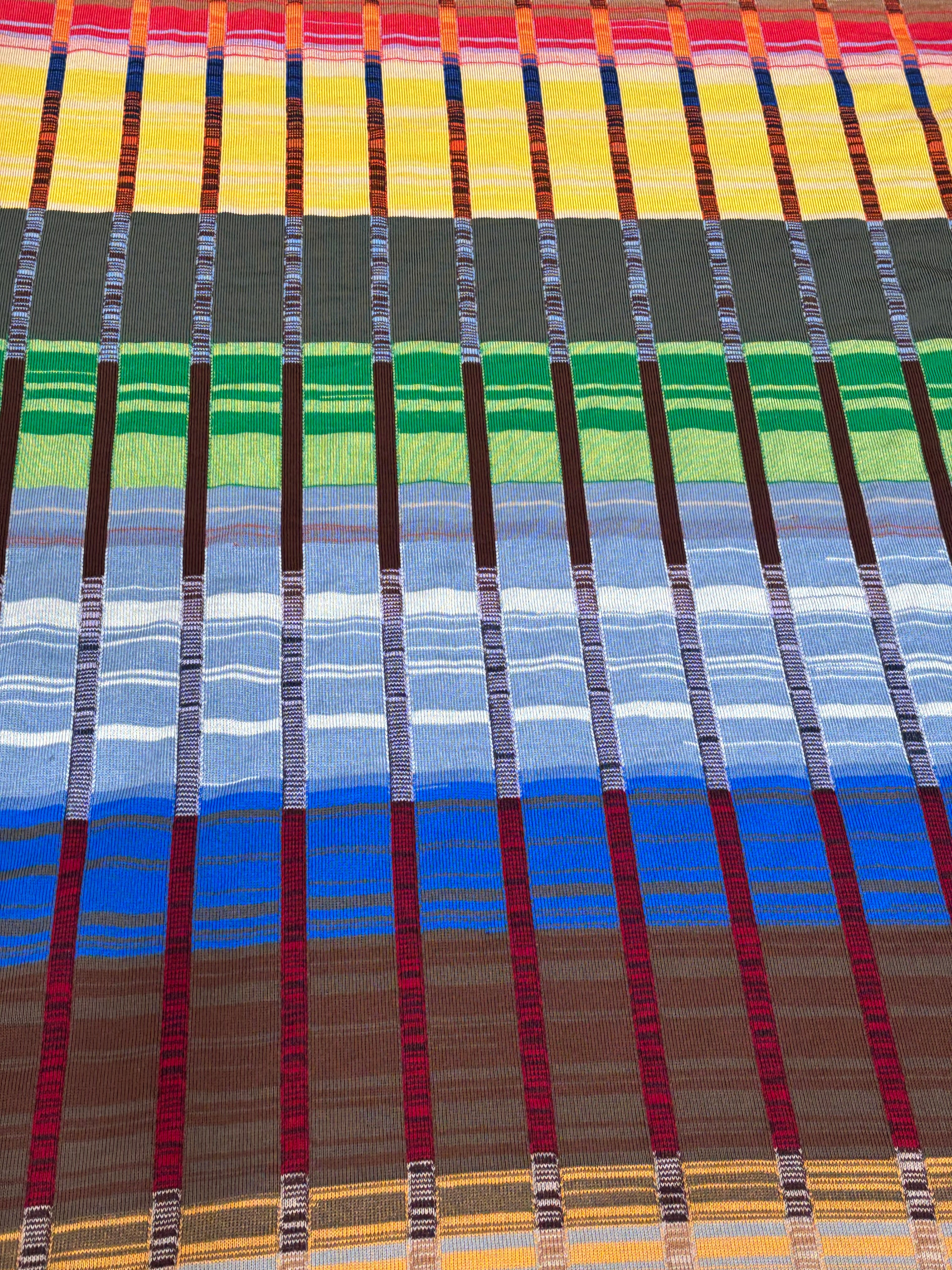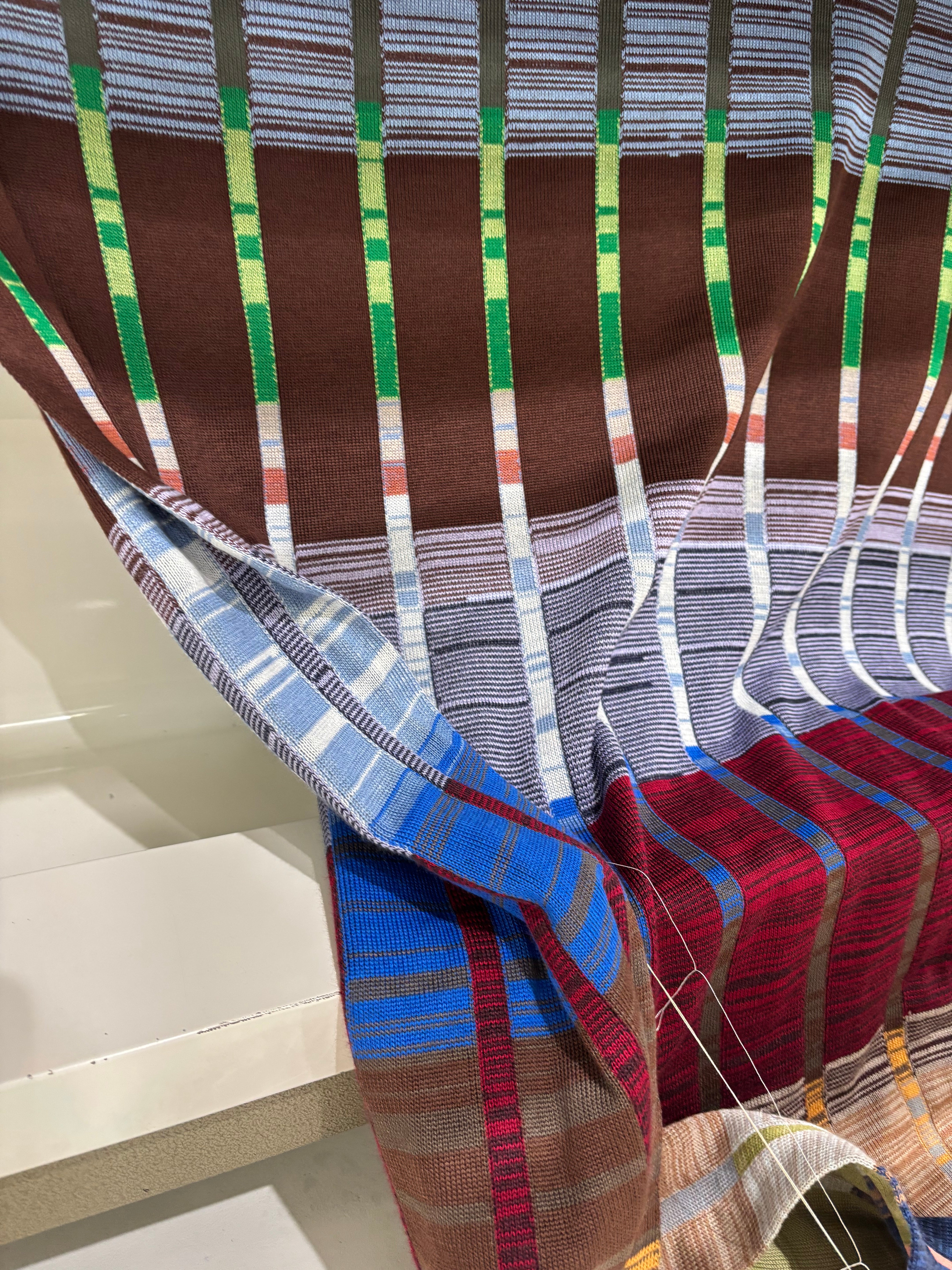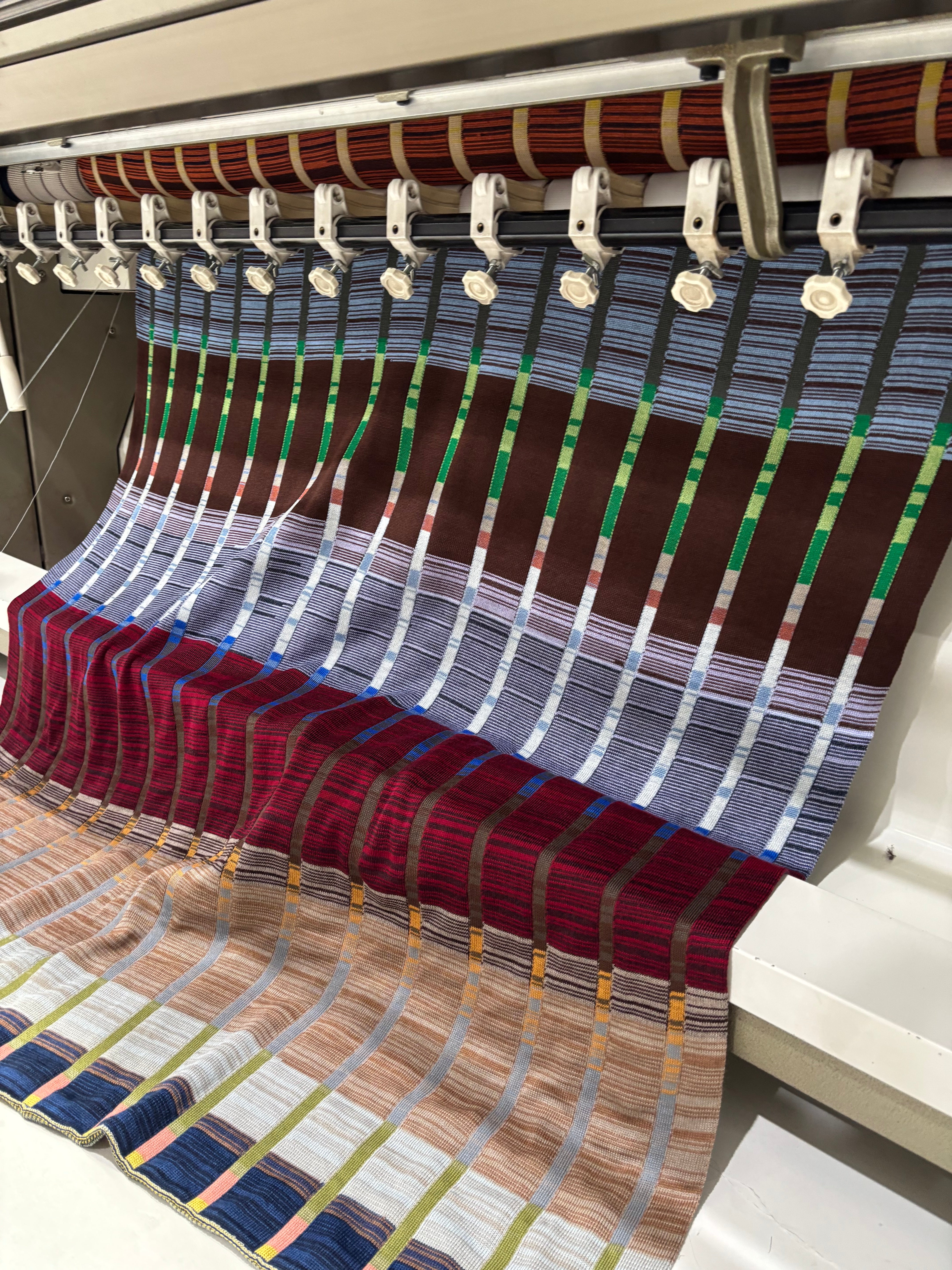 With often 300 colour changes or more, each end is tied mid-process, the fabric building the way a painting builds: stroke by stroke, yarn by yarn. There is no set order. Colours overlap, drift, and settle into each other, creating depth that exists only in the moment of making.