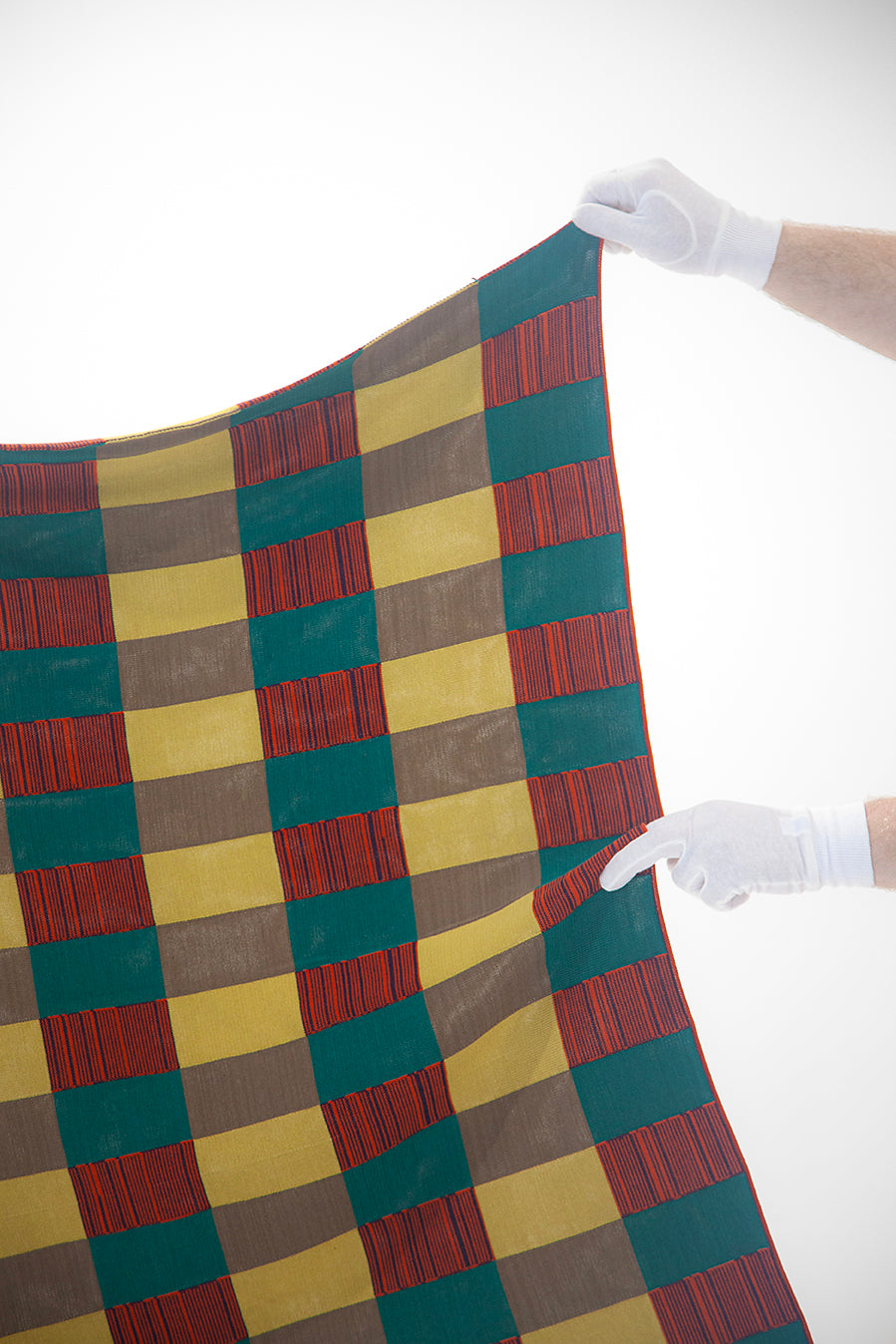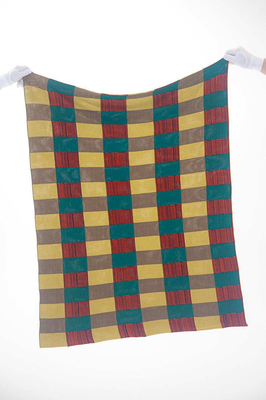 A unique, one-of-one baby blanket featuring a check design in Yellow, Green Teal, Taupe Brown, Yarn-End Orange, and Navy. A blend of colour and comfort for your little one.