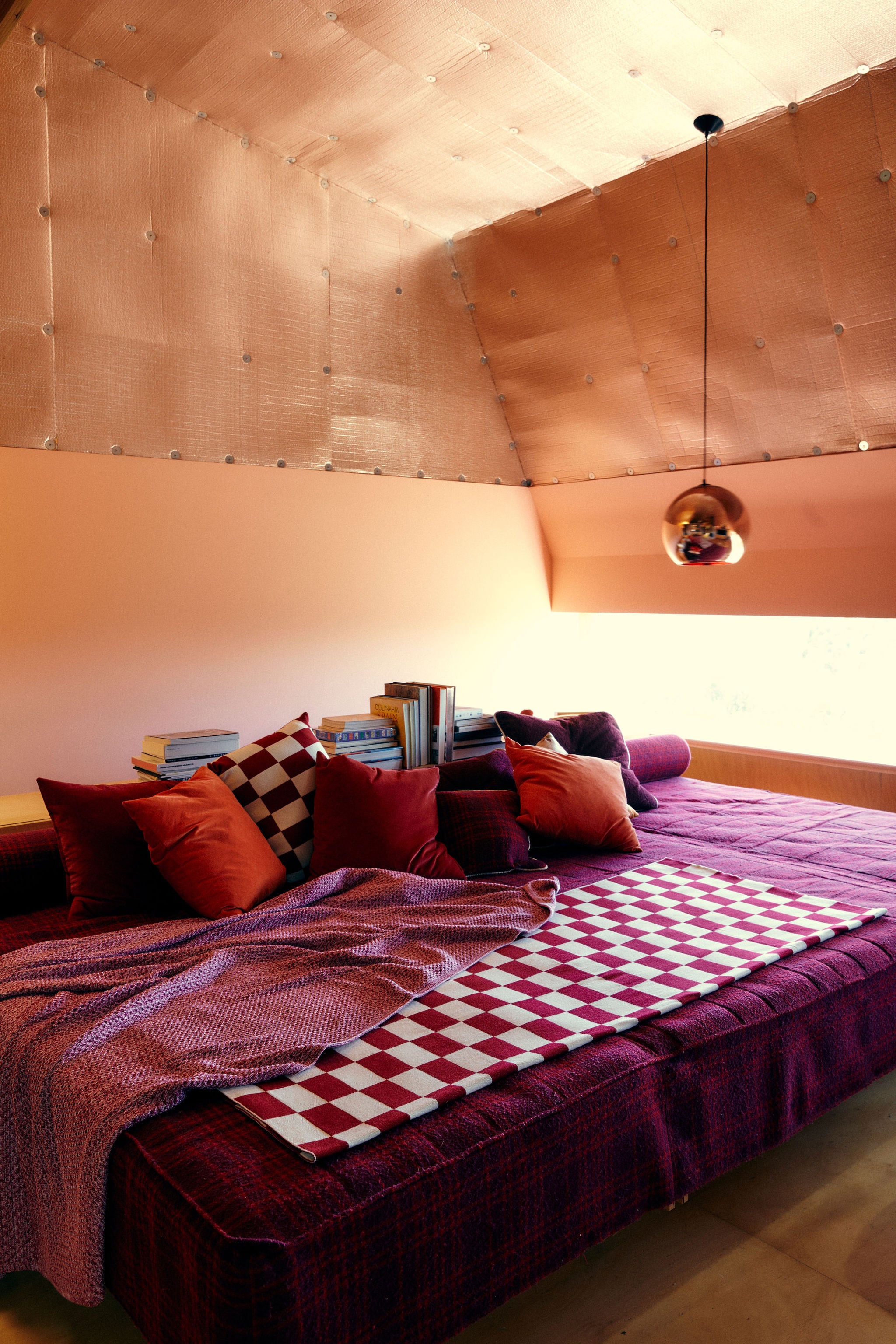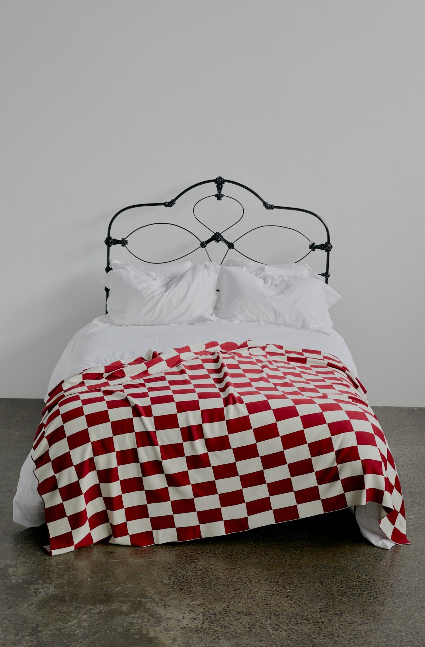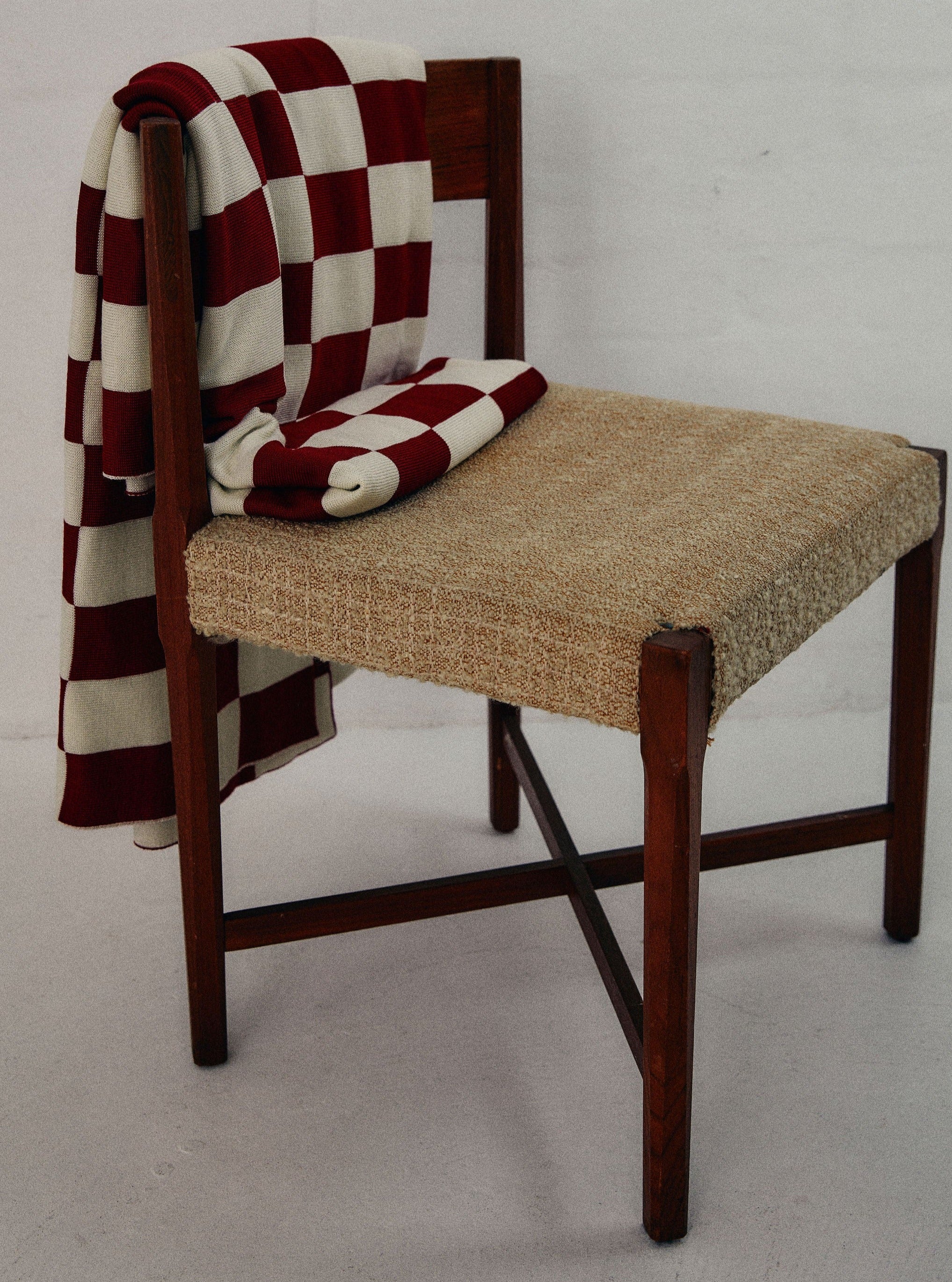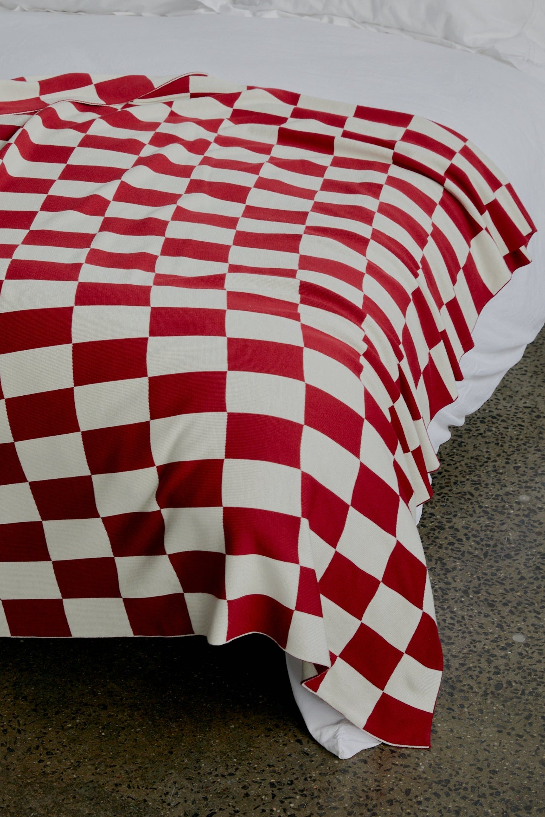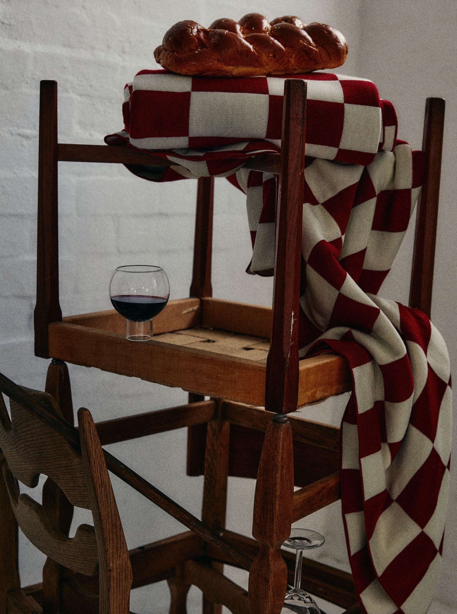 The CHERRY Blanket, crafted with precision and care. Knitted from the finest Merino wool yarn (21 microns), for unparalleled softness and durability. The modern rectangular shape and full drop repeat pattern add a contemporary touch to the timeless check motif. With the pattern featured on both sides, the blanket boasts a unique weight that sets it apart.