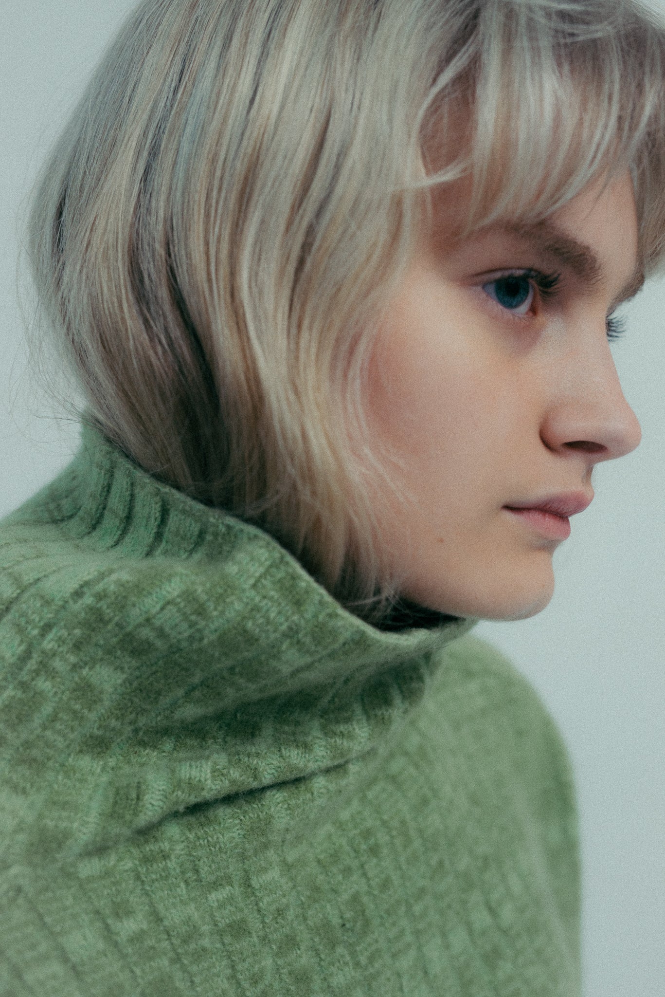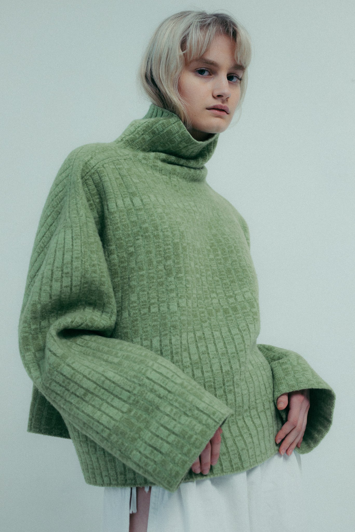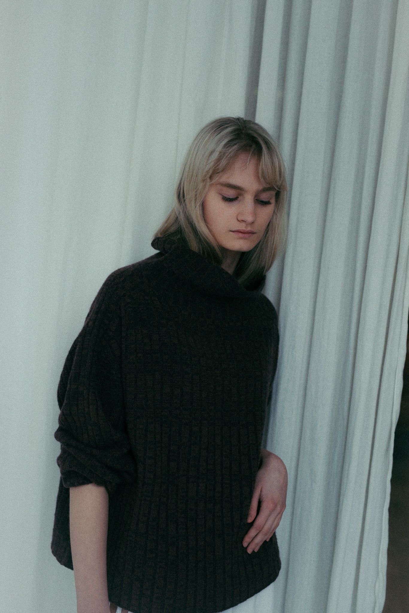 Knitted from extra-fine Australian merino wool with a count of 17.5 microns, it’s gently boiled for softness. With a relaxed, oversized fit, it features a high neck, long sleeves, and dropped straddle shoulders. The ribbed body, neck, hem, and cuffs add subtle texture, with a shorter front.