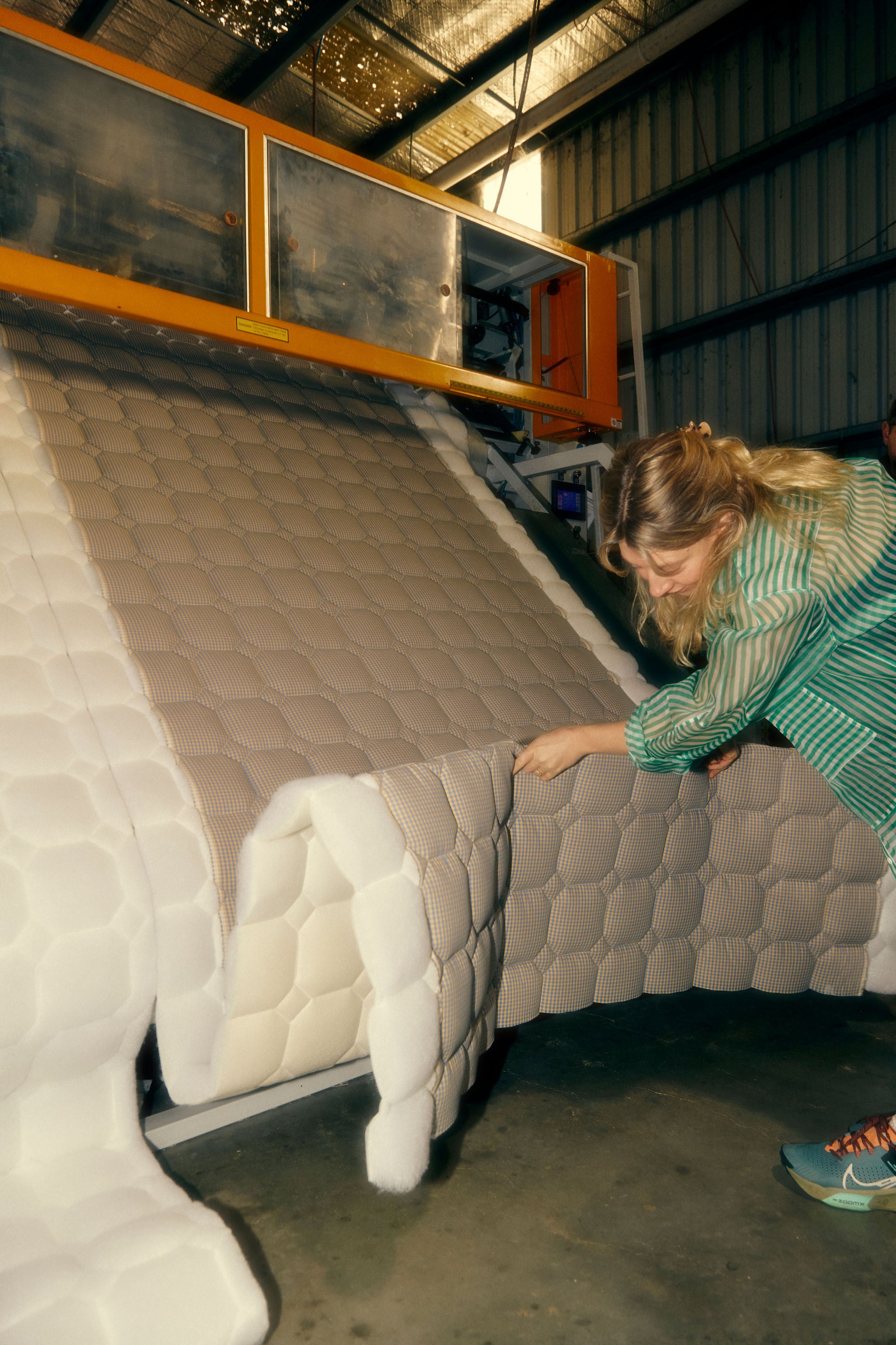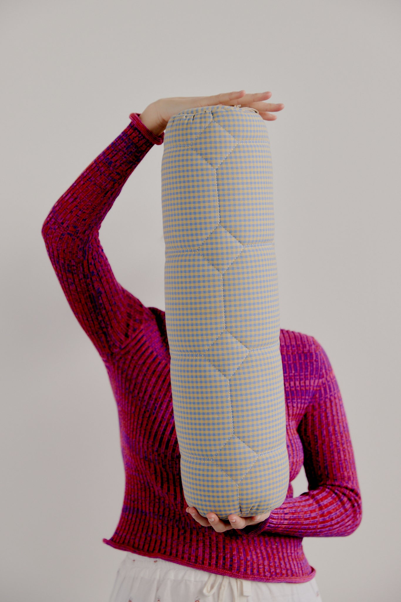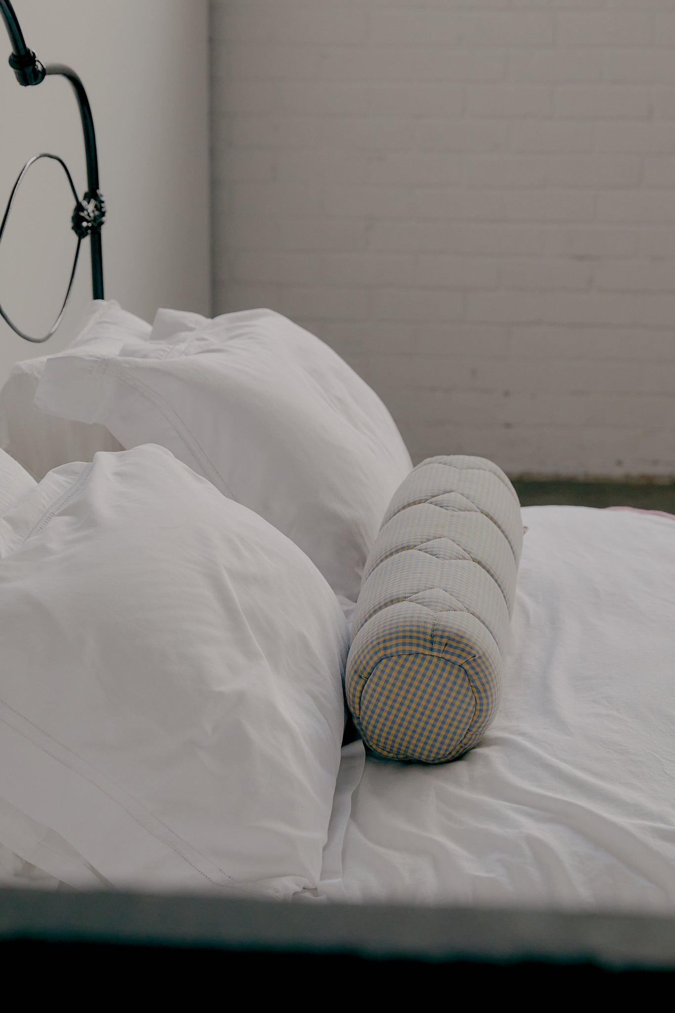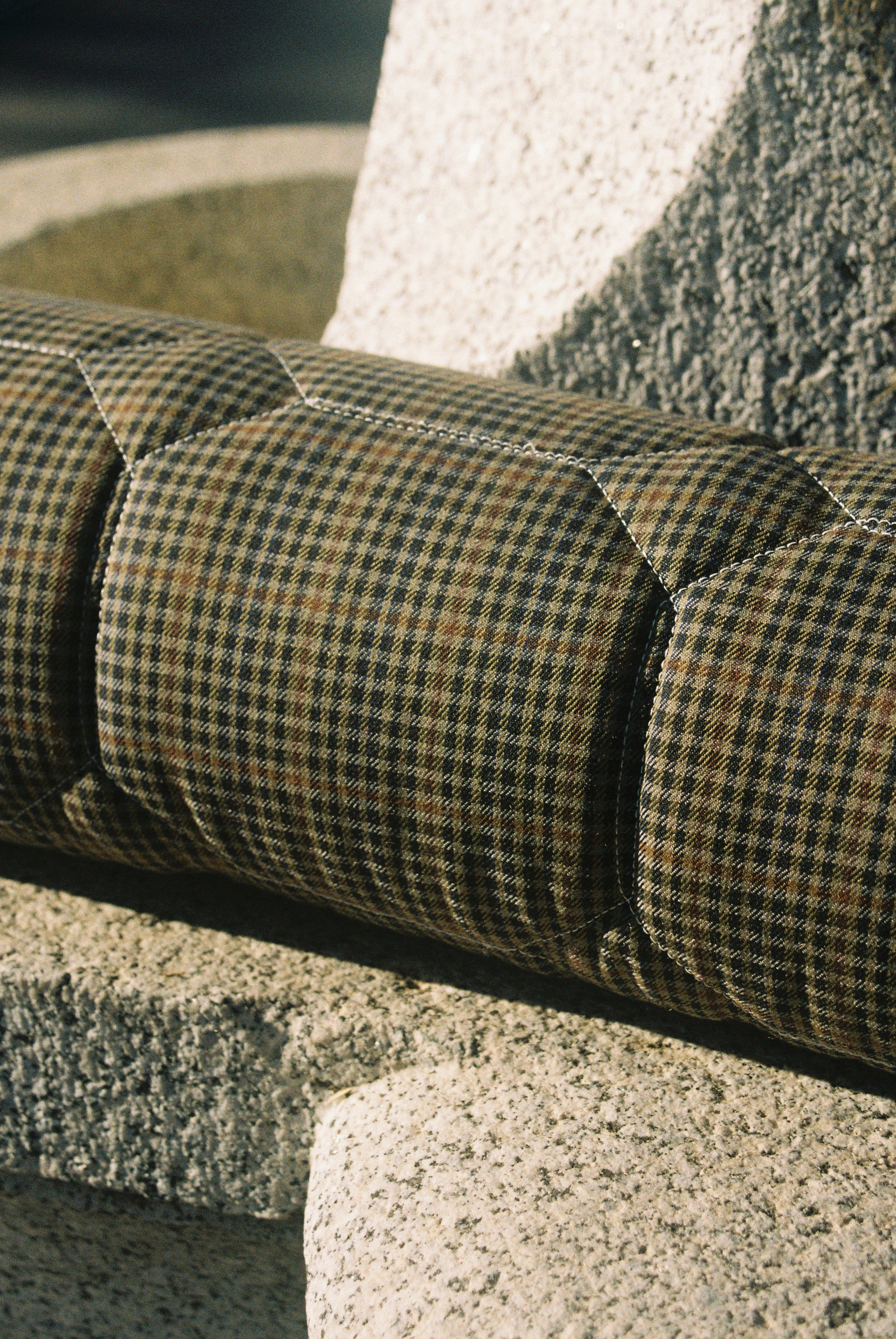 The CURIO bolster is a carefully crafted piece, wrapped in a finely woven jacquard fabric from the 1980s, a relic of Australia’s once-thriving textile industry. This fabric, originally used in coats by leading brands of the era, has been preserved until now, when it was rediscovered as a true gem. Each bolster is quilted using an unconventional process on a machine typically reserved for mattresses. This unique quilting was made possible after many weeks of experimenting with the machine, developing a secure stitch pattern that locks down the fabric and padding. The result is a limited-edition creation that reflects a deep commitment to thoughtful material design from the yarn level onward.