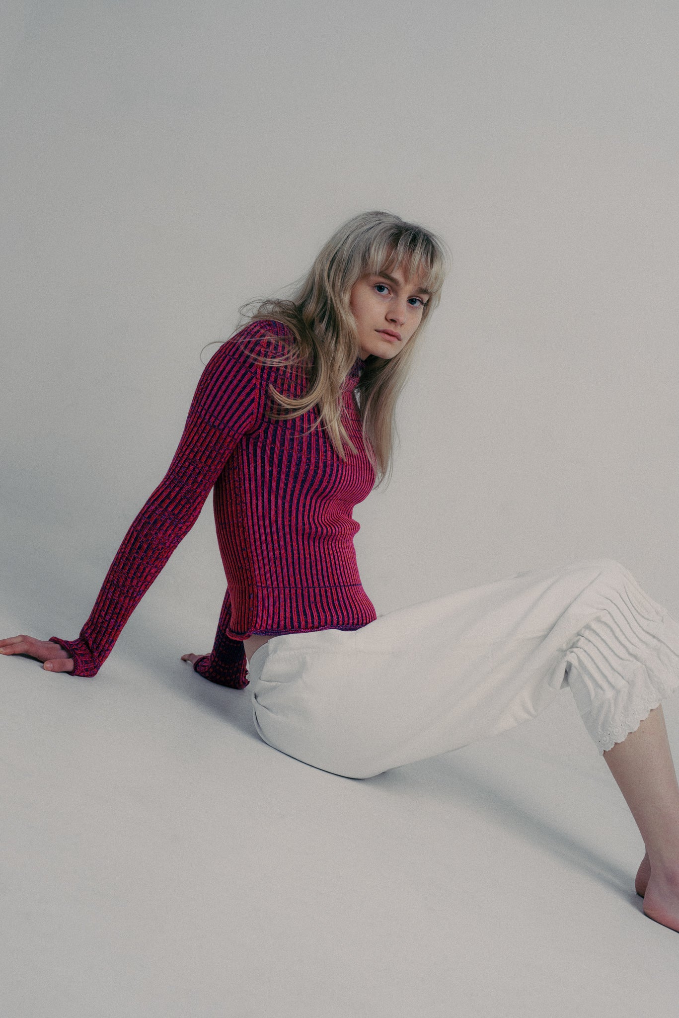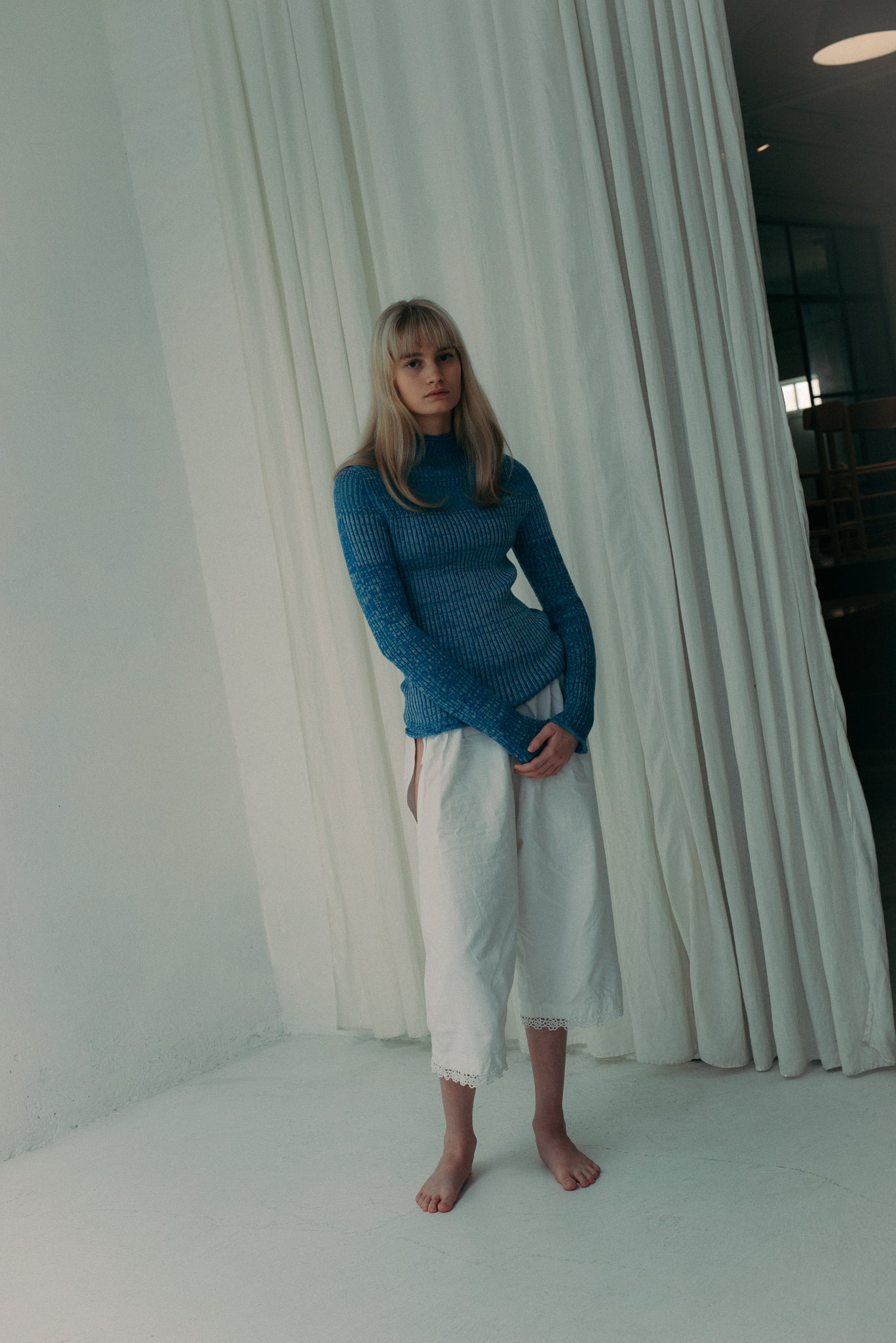 Crafted using a blend of local wool and cotton, this seam-free jumper is 3D-knitted, featuring a rib structure allowing it to fit multiple sizes and conform to your body as you wear it. It boasts a high neck and extended arm length for supreme comfort. Combining 1 end of cotton with 3 ends of wool makes it durable, resilient, and the perfect medium-weight option. We meticulously source the finest fibers to create each garment, ensuring exceptional quality. Our slow and deliberate knitting process guarantees a garment crafted to perfection. We believe in a seasonless offer, high-quality materials, and timeless designs.